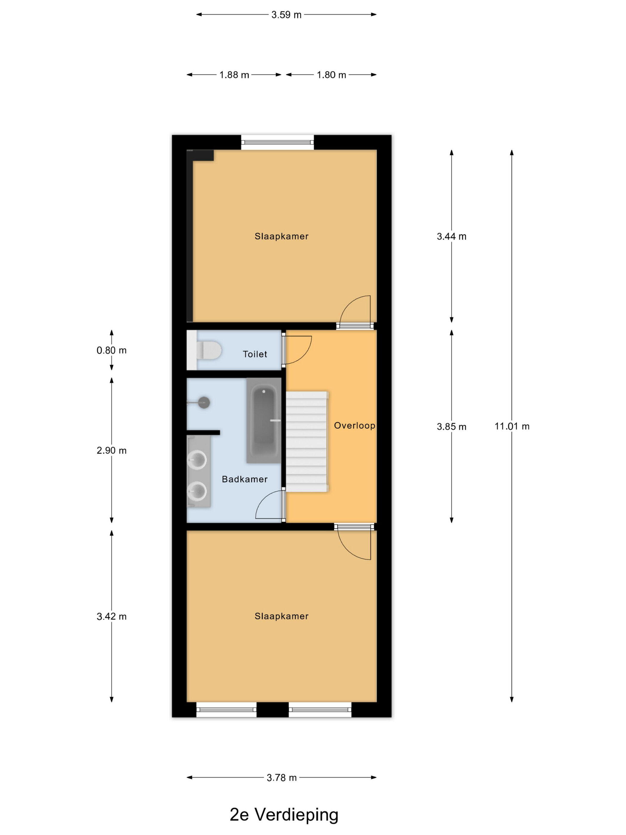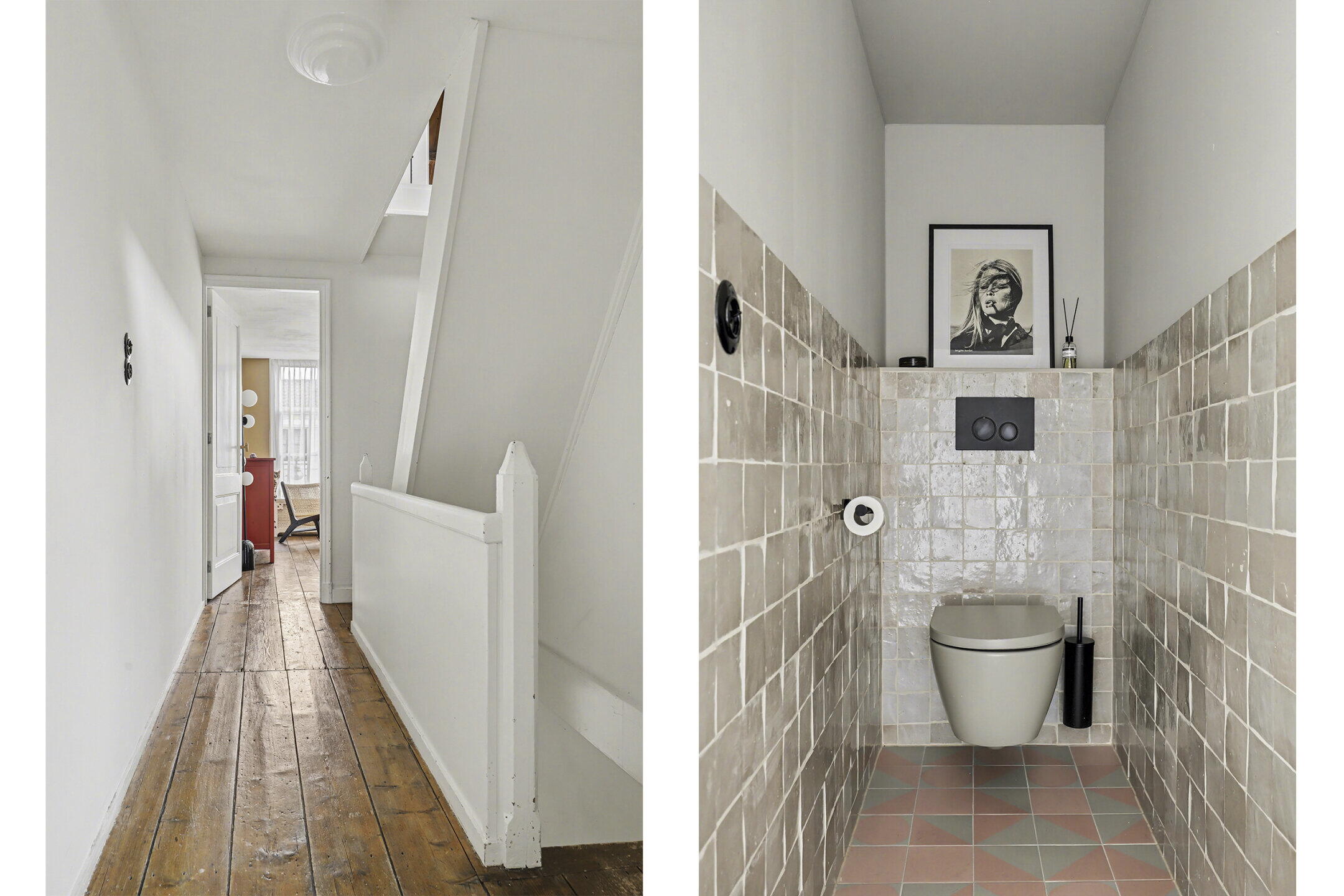 Tweede verdieping: overloop met separaat king size toilet en eveneens een voor- en een achter slaapkamer. Fraaie, nieuwe badkamer met ligbad, inloopdouche en wastafelmeubel met twee spoelbakken.