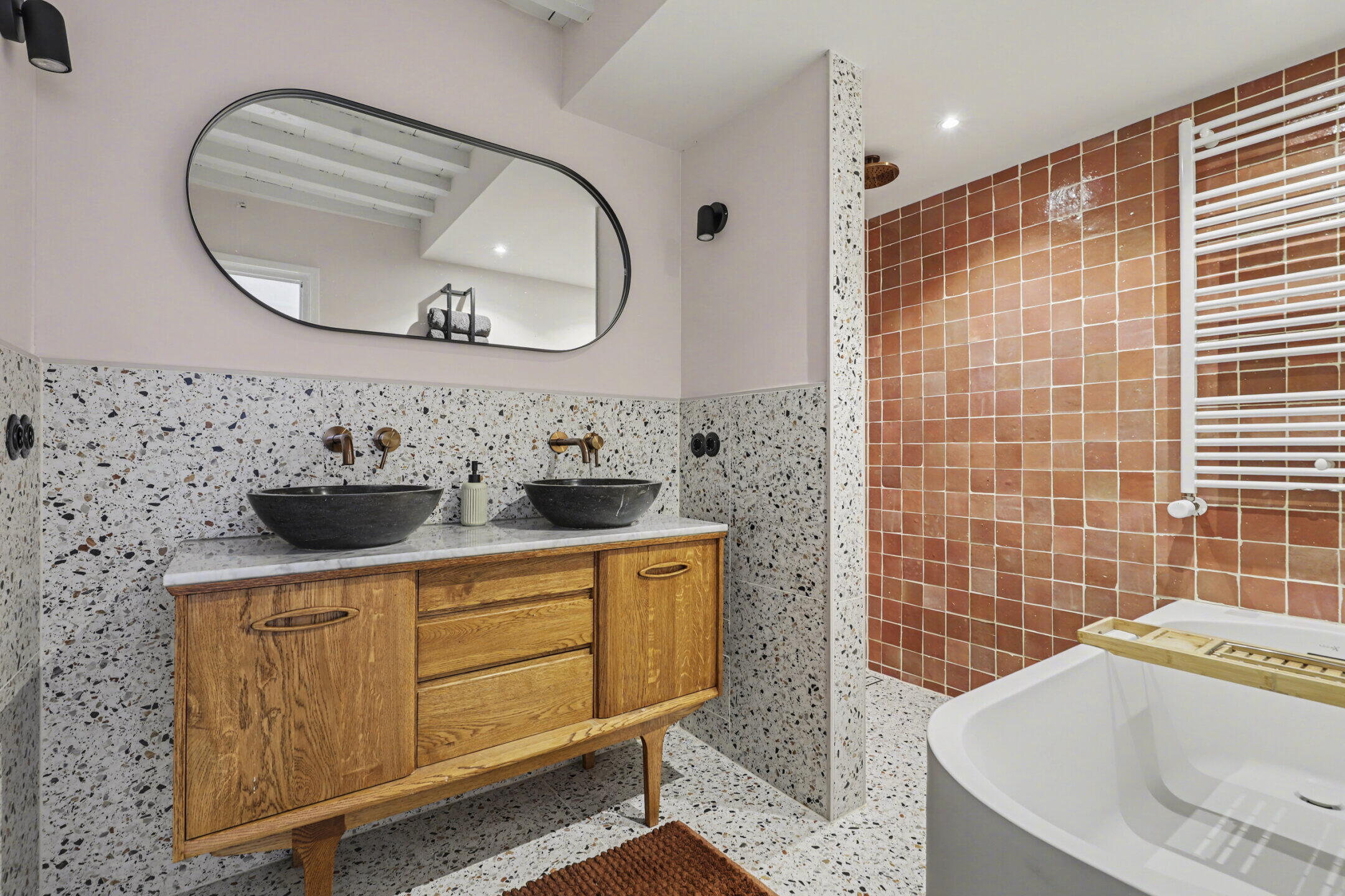 - Toilet, wastafel, inloopdouche ligbad, dubbele wastafel, wastafelmeubel, inloopdouche