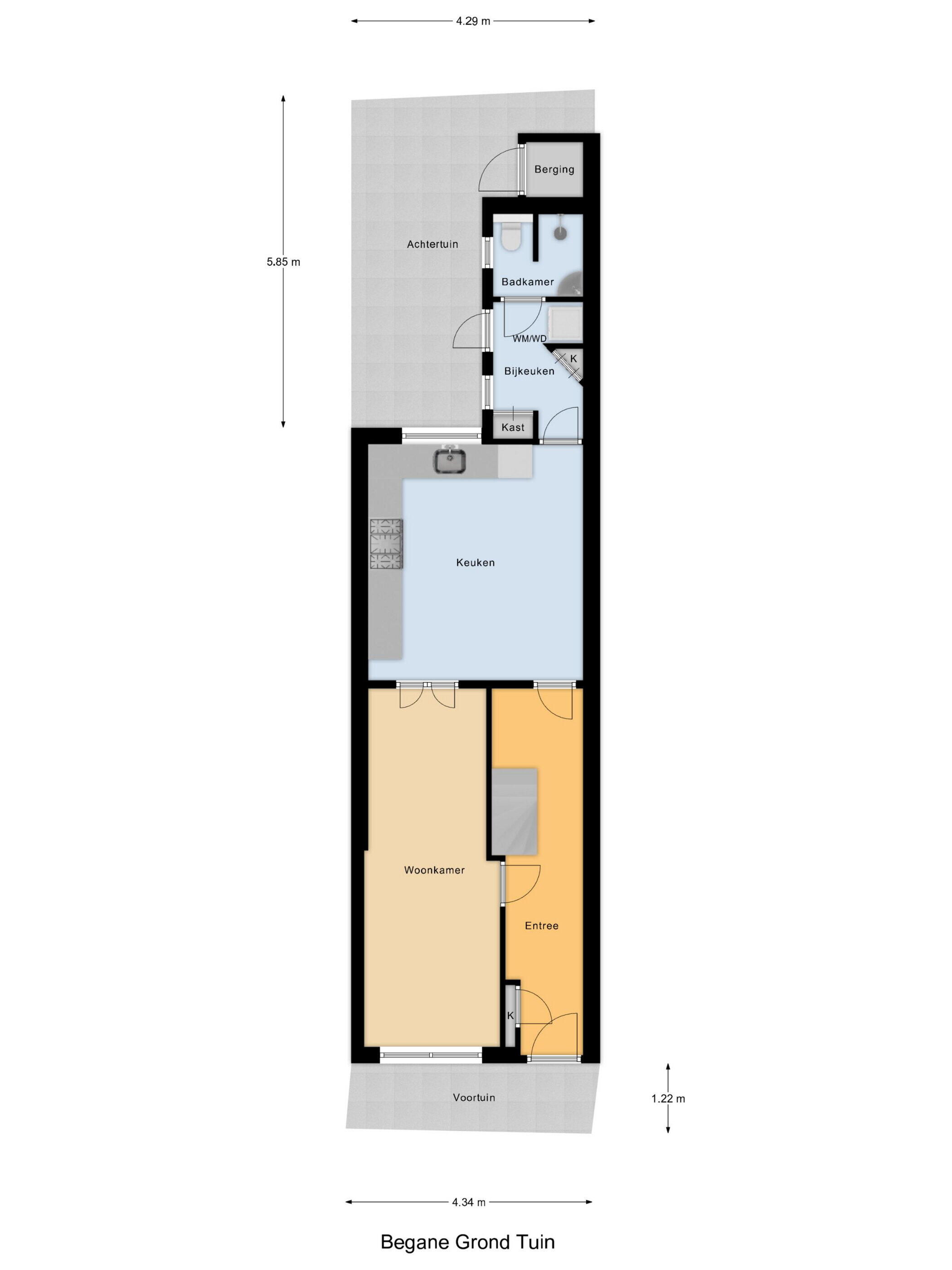 Begane grond: entree met een representatieve gang met fraaie tegelvloer met toegang naar de woonkamer en de woonkeuken. Bijkeuken met wasmachine-aansluiting en een sanitaire ruimte met toilet, inloopdouche en wastafel.