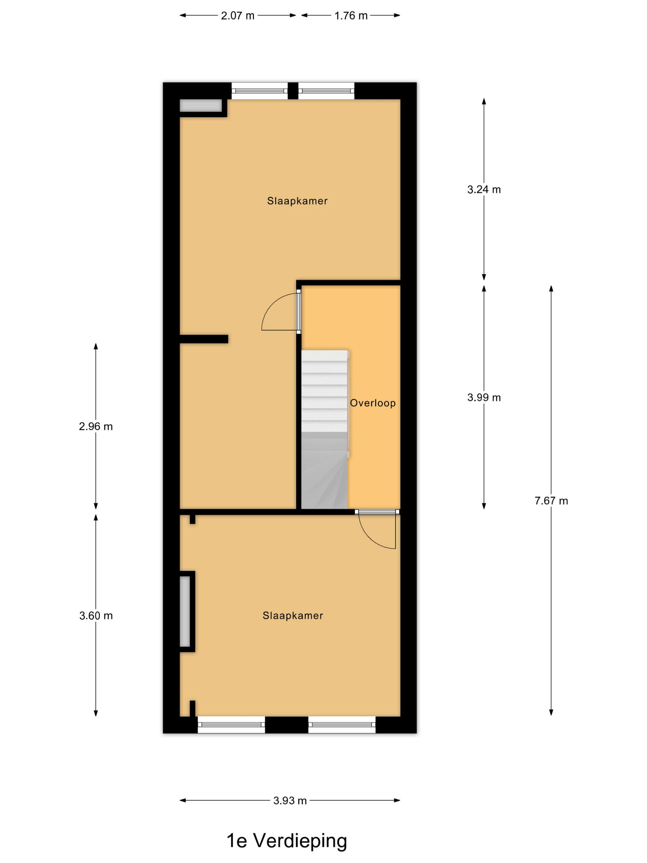 Eerste verdieping: royale overloop. Een slaapkamer van ruim 14 m2 aan de voorzijde en een achter slaapkamer met een gekoppelde inloopkamer.